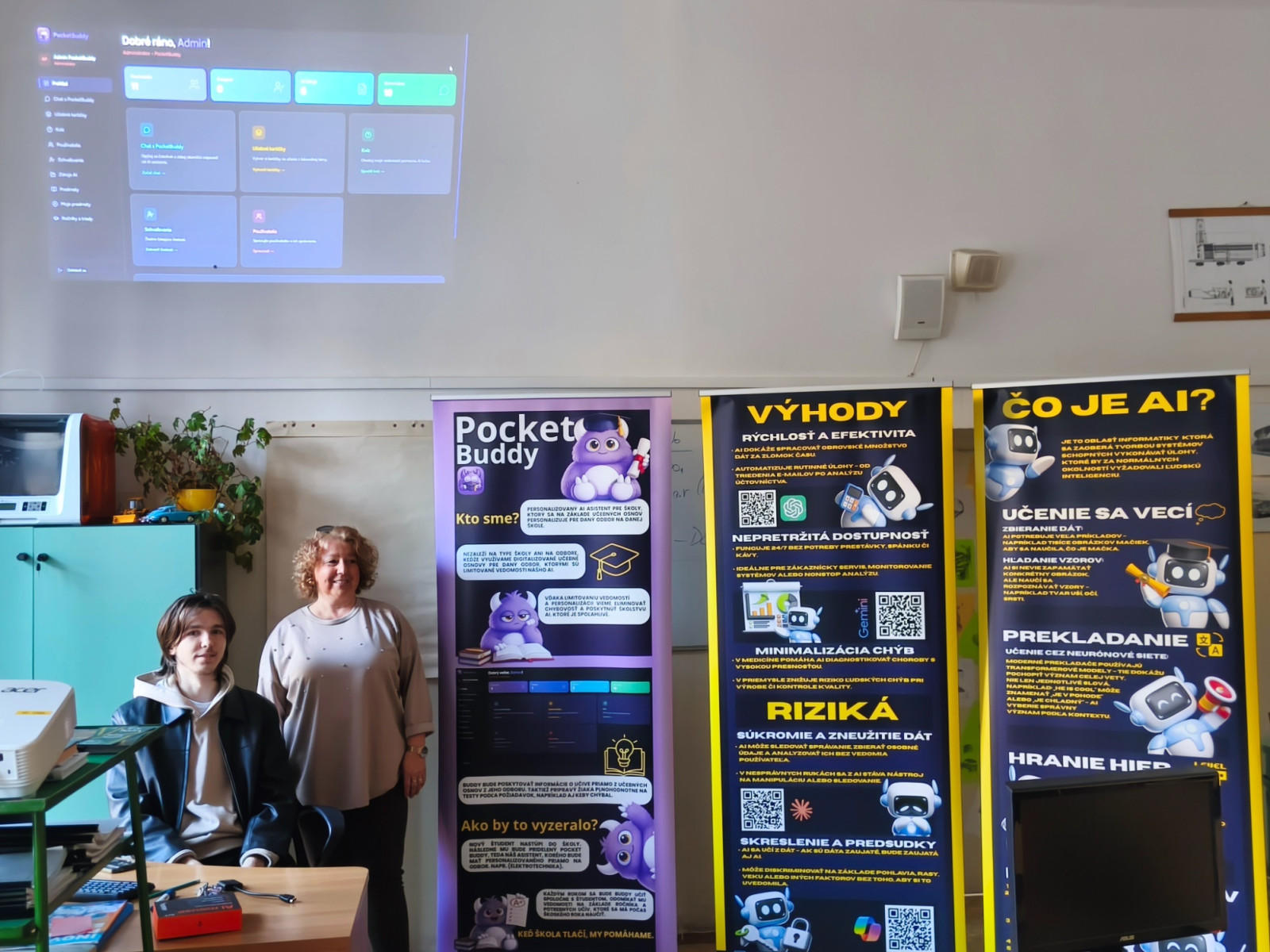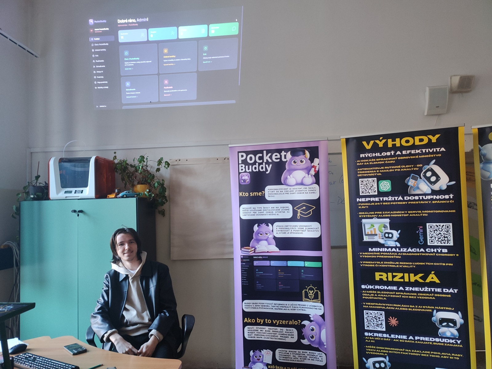 Študent Šimon Šimko odprezentoval svoju inovatívnu aplikáciu Pocket Buddy aj s roll-upom. Súčasťou workshopu bola aj odborná diskusia o rizikách a negatívach umelej inteligencie.